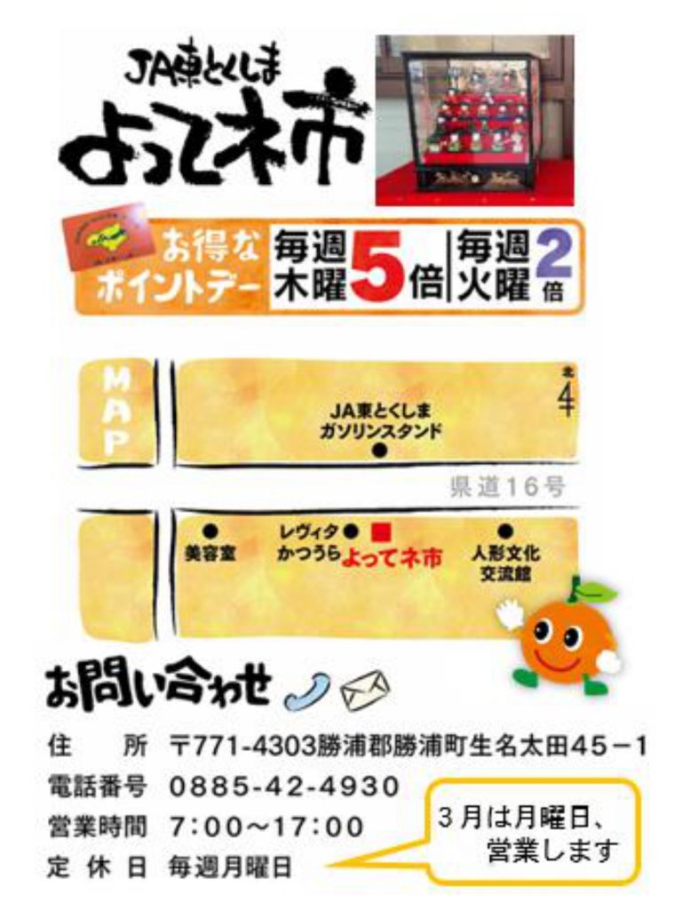 8月3日(日)「よってネ市」(勝浦郡勝浦町)にて、『夏の感謝祭』を開催します! 日頃の感謝をこめて、感謝祭当日は、お買い物ポイント10倍。 お買い物いただいた方へ、粗品をプレゼントいたします( [...]